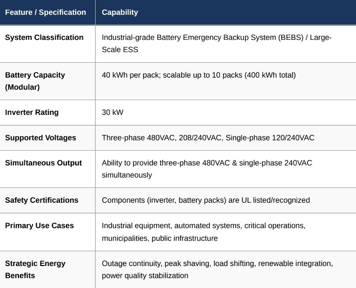The BEBS is positioned strictly as an industrial-grade backup power platform, far exceeding the capabilities of a consumer-class UPS. It is designed to provide clean, reliable backup power characterized by low emissions, minimal noise, modular scalability, and UL-certified safety. BEBS is robust enough to support heavy industrial equipment, mission-critical office spaces, automated control systems, municipal utilities, and public infrastructure.